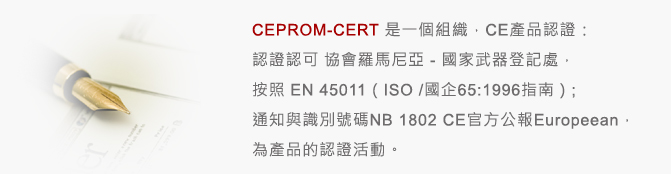 Accredited by the Romanian Accreditation Association – RENAR, according to EN 45011 (ISO/CEI 65:1996 guide);Notified by the Europeean Comission in the CE Official Journal with the identification number NB 1802, for the activity of products certification.